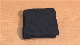 ②ゴムの履き口部分を折り込み、スッキリとした四角に