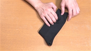 ①両足分をキレイに重ねて置き、かかと部分から足首にかけてラインで折りたたむ