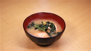 ②1度鮭をとりだし、小鍋に水を入れ沸騰したら顆粒だしを入れ、鮭、ほうれん草、コーンをいれ1分ほど加熱したら、火を止めて味噌を入れ溶けたらお椀に盛り、完成。