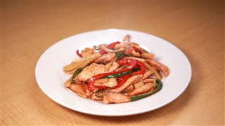 ①鮭の切り身を皮と骨を取り、細切りにカットし片栗粉をまぶす
