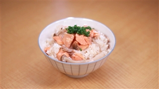 ②鮭を取り出し、皮・骨を除き、炊飯器に戻してざっくり混ぜて、茶碗に盛り小口切りしたねぎを飾り完成。
