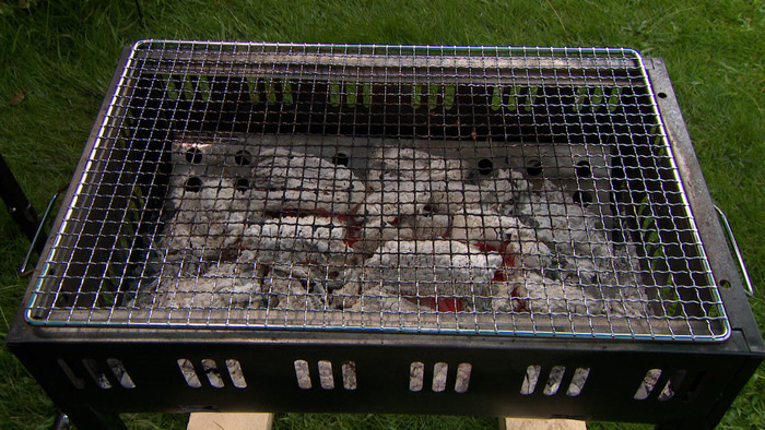 ② 15分後、焦げが白く灰になったのを確認したら網を冷ます。