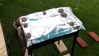 ▶ポイント 隙間がないようにアルミホイルかぶせ、アルミホイルが風で飛ばないよう、石を上に置く。
