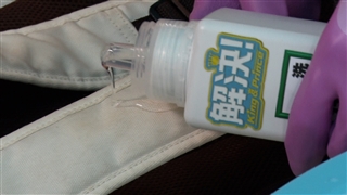 ③ そのほかの汚れの部分は衣類用中性洗剤を適量水に混ぜ、その水をスポンジに染み込ませ、拭くような形で洗う。