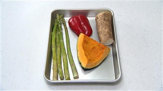 ② かぼちゃやアスパラガスは、焼いた時に乾燥しシワシワになりやすいためオリーブオイルを塗る。