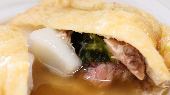 ①油揚げにもち、ほうれん草、サバの水煮を入れる。