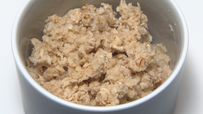 | ① | オートミール30gに対し水50mlを加え、全体を湿らす。 |