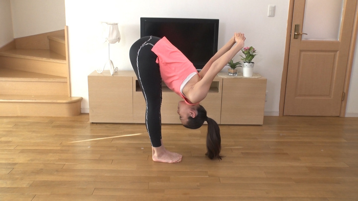 ④さらに余裕があれば、立ち上がって、膝を軽く曲げ、前屈。
