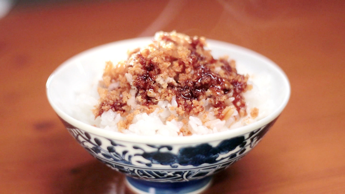 | ② | ごはんをよそい、炒めたひき肉とパン粉をのせ、中濃ソースをかけて完成! |