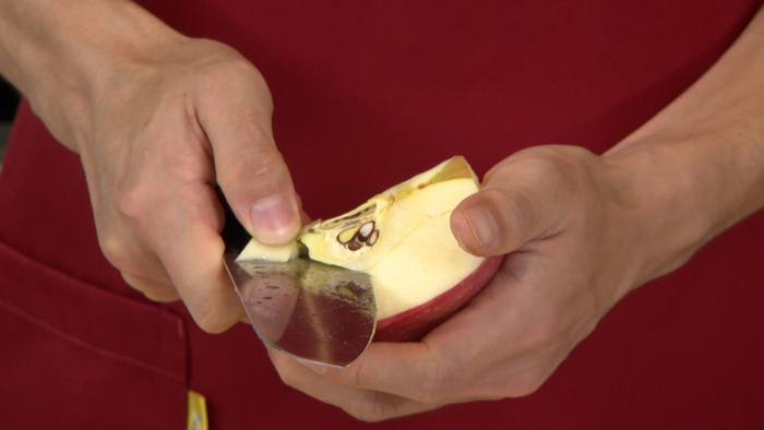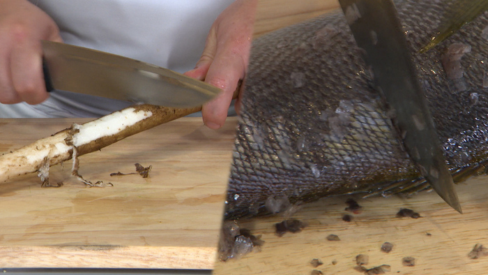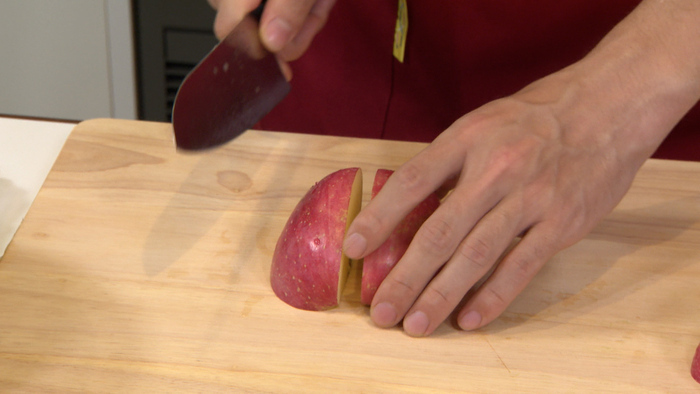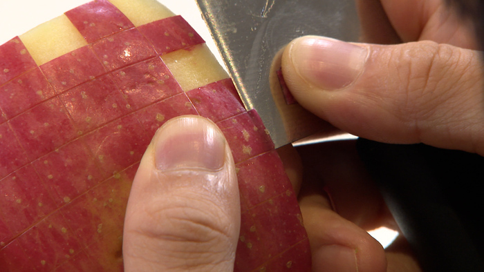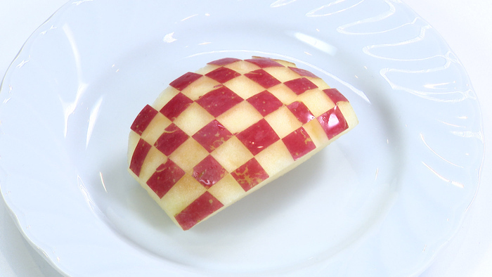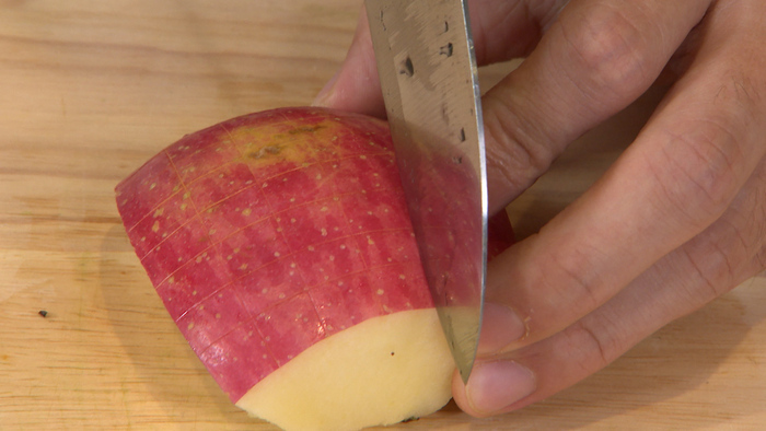 ③切れ目を入れ終えたら、包丁のアゴを使って皮を市松模様になるように交互に剥いでいき、完成!