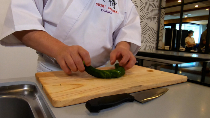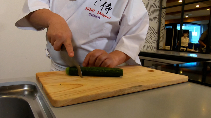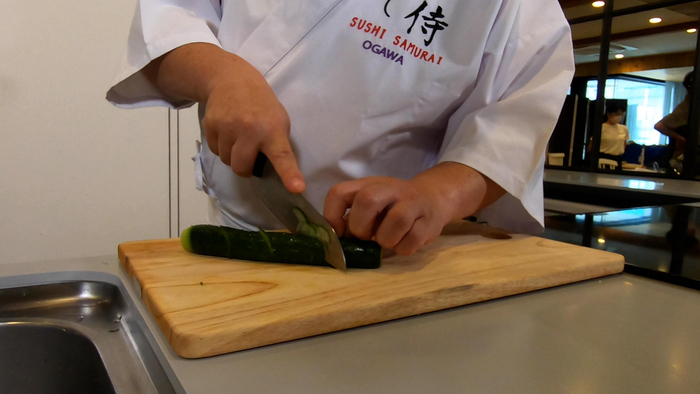 きゅうりの蛇腹切りを作るこの動作に、包丁の基本の全てが入っており、同じ角度・同じ幅・同じ深さにそろえる切り方はどんな料理でも応用できる!