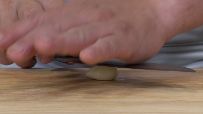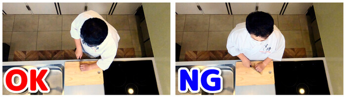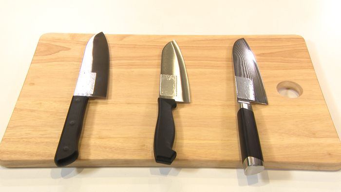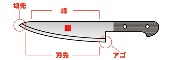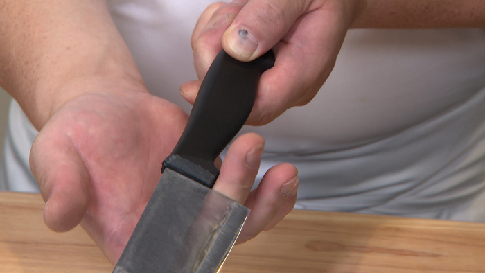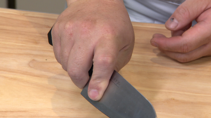 柄を握るだけだと、包丁の向きがブレやすいため、三点留めする形で持つ!