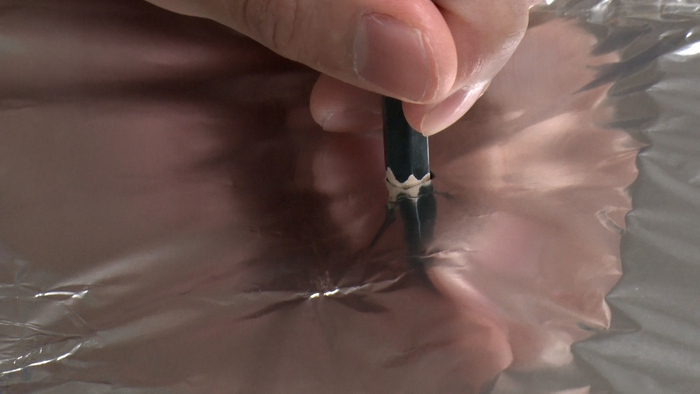①芯に切り込みを入れ、輪ゴムで挟み止める。