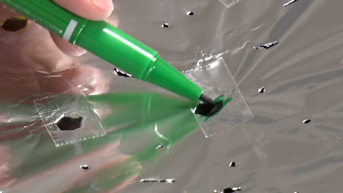 ④大きい穴にテープをランダムに貼りマジックで色をつける。