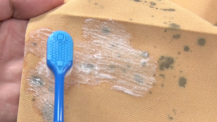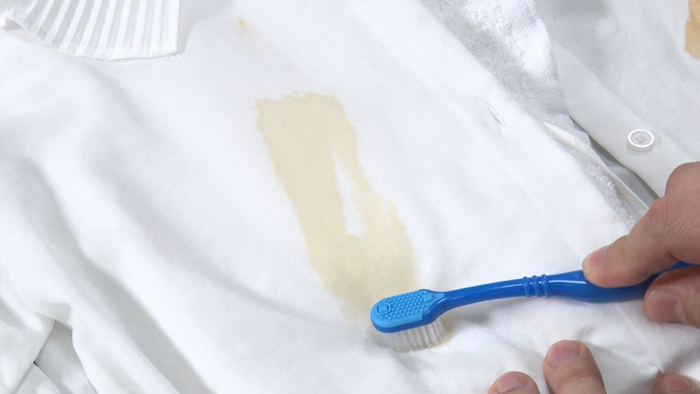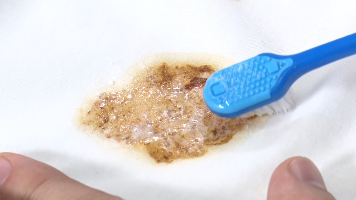 ②中性洗剤をつけた歯ブラシにつけるシミ部分を叩く