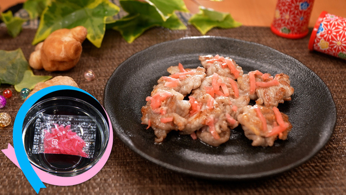 ②ボウルに切った豚こま切れ肉と紅生姜、片栗粉、塩胡椒を入れて、よく揉み込む