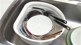 ②ヘラを使って汚れを剥がす桶にある程度汚れを剥がした食器をつけおく。