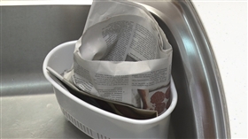 ①三角コーナーに古新聞を置いてその中に汚れを落としていく。