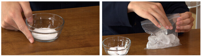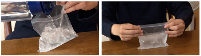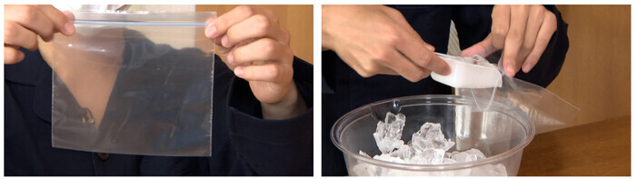 ①Sサイズのジップ付きの袋に氷を10個ほど入れる。