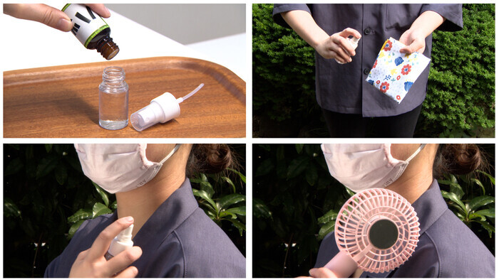 スプレーボトルに水とハッカ油を2、3滴入れ、携帯しておけば外出時にもハンカチにかけたり、ハンディファンをする前に肌に一吹きすれば清涼感を味わえる!