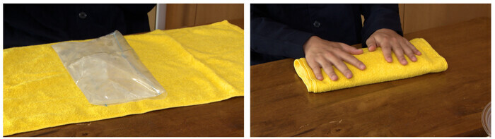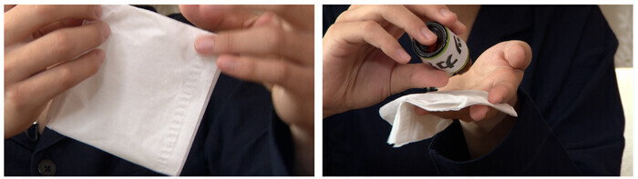 ①ティッシュを四つ折りにし、ハッカ油を2、3滴垂らす。(◎これを2つ作る)