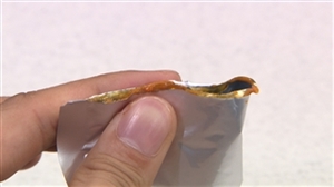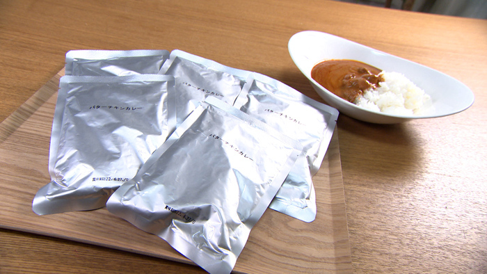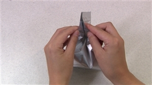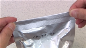 ①レトルトパウチの切り口部分に折り目をしっかりつける。