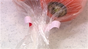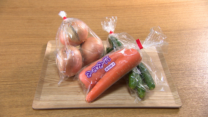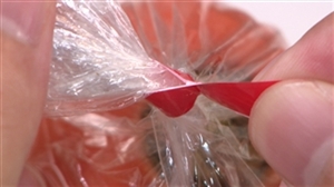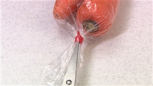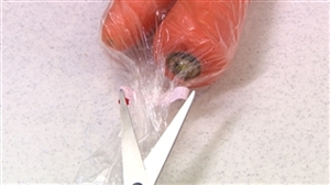 ①ハサミを野菜の袋と赤テープの隙間に差し込む