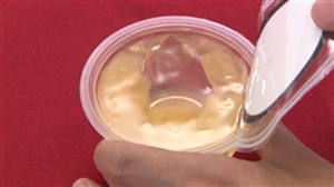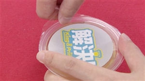 ①開け口を奥にして、左手の人差し指と中指でフタが貼っている部分を固定。
