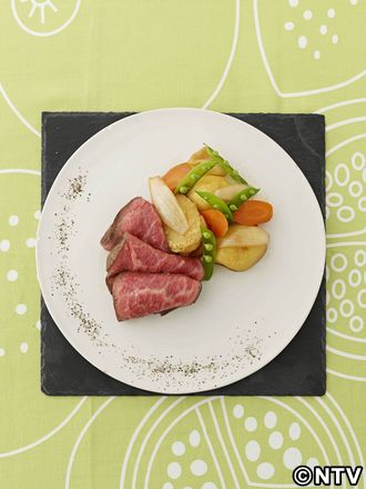 - 器に盛り付け、(2)の牛肉を食べやすく薄切りして盛り付け、スナップえんどうを開いて盛り添える。