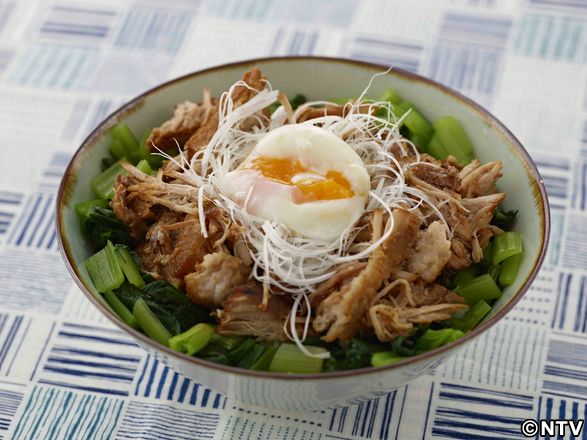 - 丼にごはんをよそって、3~4cm長さに切った小松菜を敷いて、(2)の角煮を盛り付け、白髪ねぎ、温泉卵をのせる。