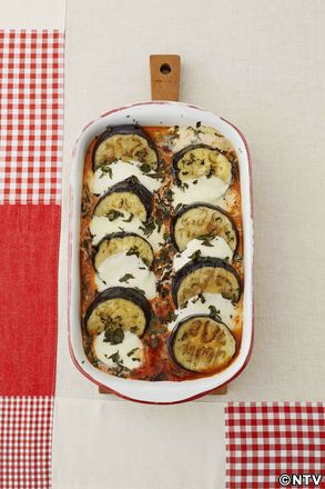- (3)に、(1)、輪切りにしたモッツァレラチーズを交互に並べ、刻んだバジルをのせ、220度に予熱したオーブンで約15分焼く。