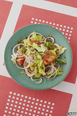 - レタスは1~2cm幅に切り、紫玉ねぎはスライサーで薄く輪切りにし、水で洗ってから、サラダスピナーで水気を切りボウルに入れる。