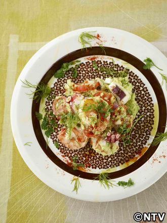- 器に(4)を彩りよく盛り付け、ちぎったディルとチャービルを飾り、パプリカパウダーを振り、オリーブオイルをかける。