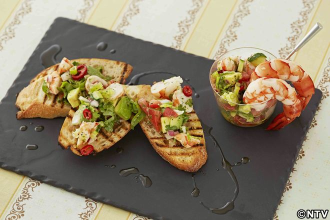 - グラスに(3)を盛り、エビを飾り付け、焼いたバゲットの上にものせて盛り付け皿にのせる。