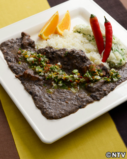 オレンジ、赤唐辛子、(4)を添え、(6)をかける。