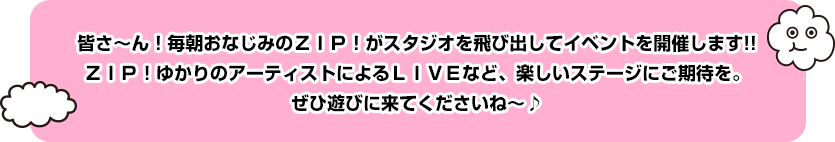 皆さ~ん!毎朝おなじみのZIP!がスタジオを飛び出してイベントを開催します!!ZIP!ゆかりのアーティストによるLIVEなど、楽しいステージにご期待を。ぜひ遊びに来てくださいね~♪