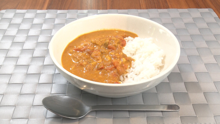 ② 材料Aを鍋で炒め、ぶつ切りにしたトマト(完熟)を加える。トマトが煮崩れたら、材料B・残りの野菜ブイヨンを入れ約15分弱火で煮る。