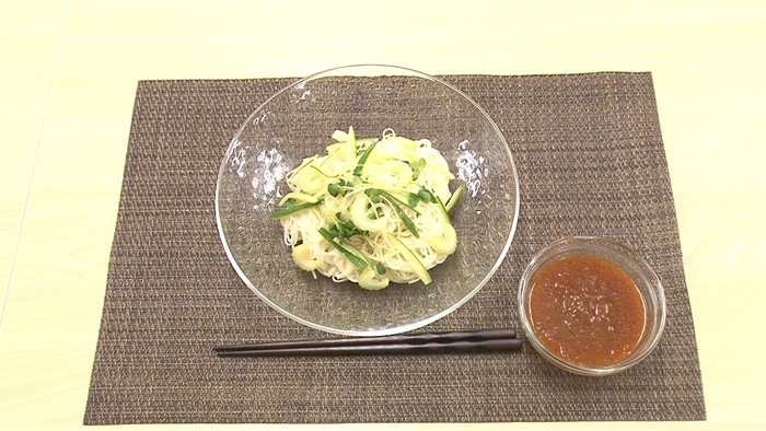④そうめんを器に盛りつけたあと、きゅうりを乗せ、②で混ぜあわせたタレをかける。