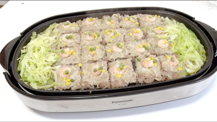⑥ 分量の水を回し入れ、蓋をして高温(250度程度)で熱する。ジュージュー音がしてから10分加熱する。しゅうまいにふっくらと火が通ったら保温に。ヘラでお好みの大きさにカットしてとりわけ、酢醤油やポン酢などお好みのたれを添える。
