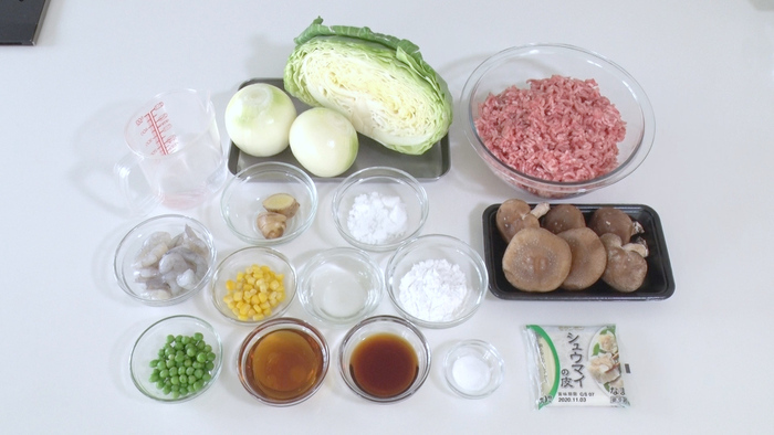 ① ボウルに【A】を入れて混ぜてから豚ひき肉を入れて白っぽく粘りがでるまでよく練る。たまねぎとしいたけを入れて混ぜ、冷蔵庫で30分以上寝かせて味をなじませる。
