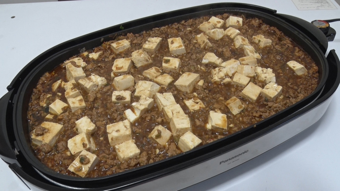 ④ ホットプレートを140度にして、豆腐をヘラで崩して温めて保温に。