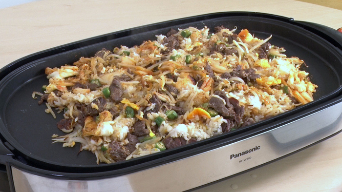 ② ホットプレートに、ごま油大さじ2をひき、半面に牛肉、半面にごはんをのせてフタをする。140℃で7分加熱する