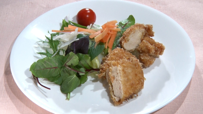 ⑥ ③で味付けした鶏むね肉に、⑤のパン粉をつけて、170℃の揚げ油できつね色になるまで揚げて完成。