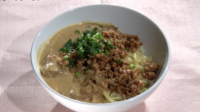 ③ 器に◯を入れ、その上に麺・豚挽き肉・ねぎを乗せたら完成!