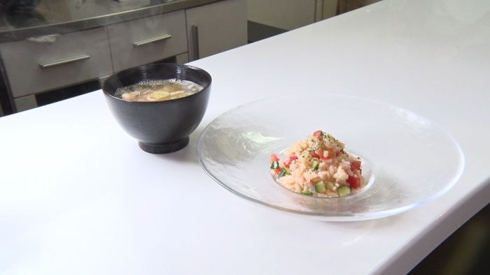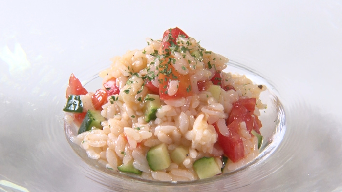 ②ごはんの水気を切って、ダイスカットした野菜とあわせる