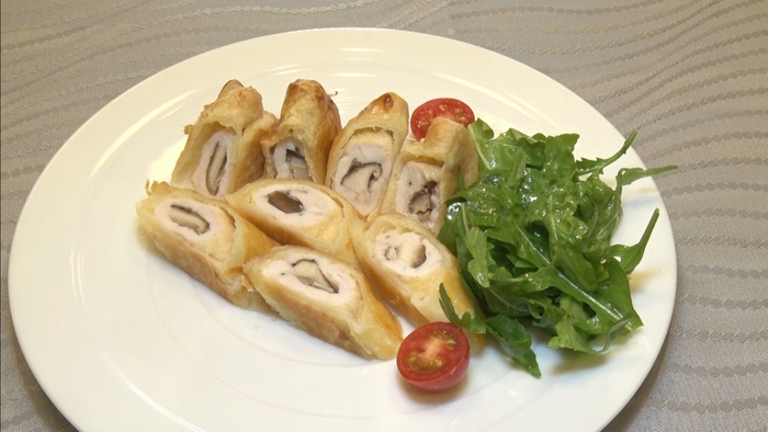 ③ パイシートに卵黄をぬり、①のささみを乗せ包み、表面にも卵黄を塗る